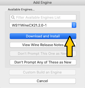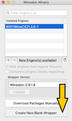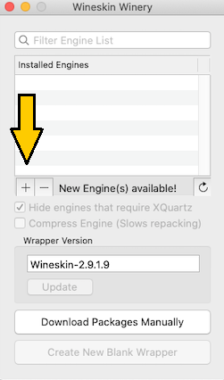 Ouvrez Wineskin Winery. Mettez à jour la version du wrapper si nécessaire. Cliquez sur [+] pour ajouter un nouveau moteur et choisissez la version la plus récente.