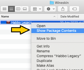Ouvrez le wrapper, faites un clic droit et choisissez Afficher le contenu du paquet. Ouvrez le dossier drive_c et copiez le Habbo Launcher (64 bits) depuis ce téléchargement à l’intérieur.