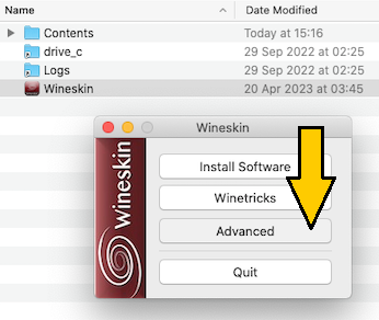 De retour dans le dossier principal, ouvrez Wineskin et choisissez Advanced. Via Browse, sélectionnez l’exécutable .exe dans le dossier drive_c. Ensuite, fermez Wineskin.